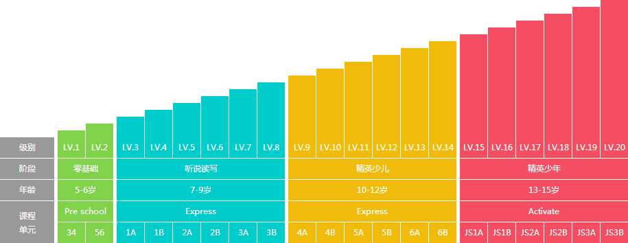 针对5-6岁、7-9岁、10-12岁、13-15岁四个不同年龄段的孩子,分为20个级别,按目前孩子级别进行一对一VIP方式授课。
